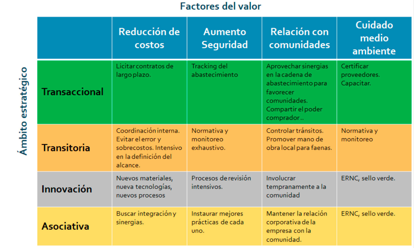 Nuestros proveedores impactan directamente en el costo y trabajamos permanentemente en reducirlos. Nuestros procesos de compra están siempre enfocados a la reducción de costos y no siempre aprovechamos las distintas fuentes de valor que los proveedores nos pueden aportar.